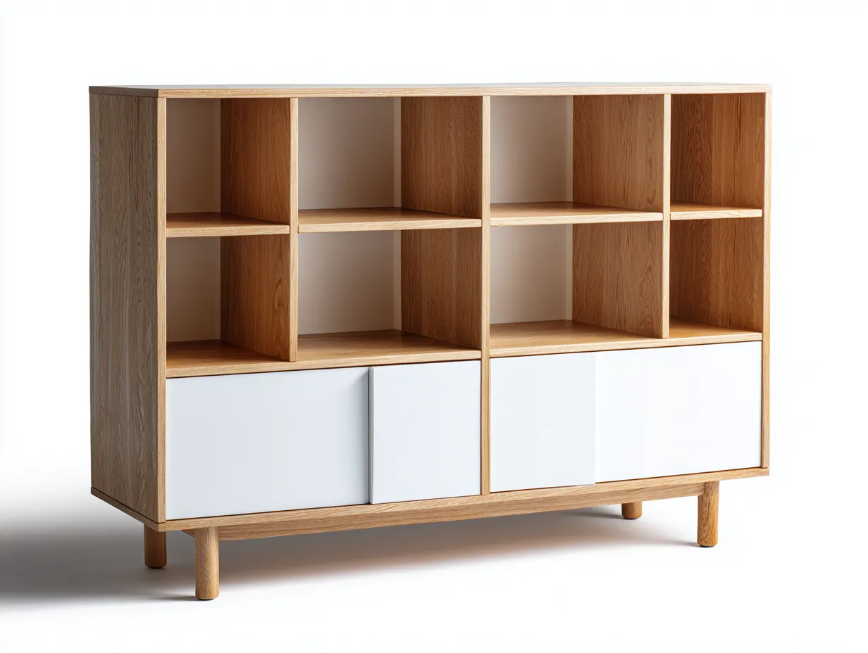 La parte superior cuenta con compartimentos abiertos que permiten organizar libros plantas o elementos decorativos. La zona inferior dispone de un armario cerrado que ayuda a mantener guardados objetos de uso diario manteniendo el espacio ordenado. Su diseño amplio ofrece almacenamiento práctico sin ocupar excesivo espacio vertical.