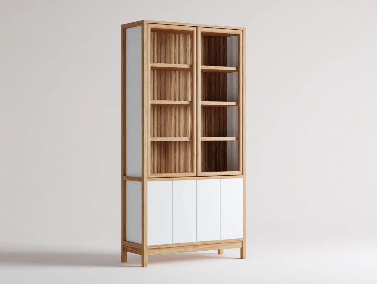 Esta estantería está diseñada para proporcionar una solución práctica de almacenamiento y exposición en el hogar. Su diseño vertical permite aprovechar mejor el espacio en salones dormitorios o zonas de trabajo. La combinación de madera natural y paneles blancos crea un estilo equilibrado que se adapta a interiores modernos o de inspiración escandinava.